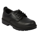 Black action leather water resistant safety shoe. Padded collar and tongue for added comfort. Steel toe cap and steel midsole protection. Dual density polyurethane outsole. Anti-static. A traditional lightweight safety shoe for most industries.